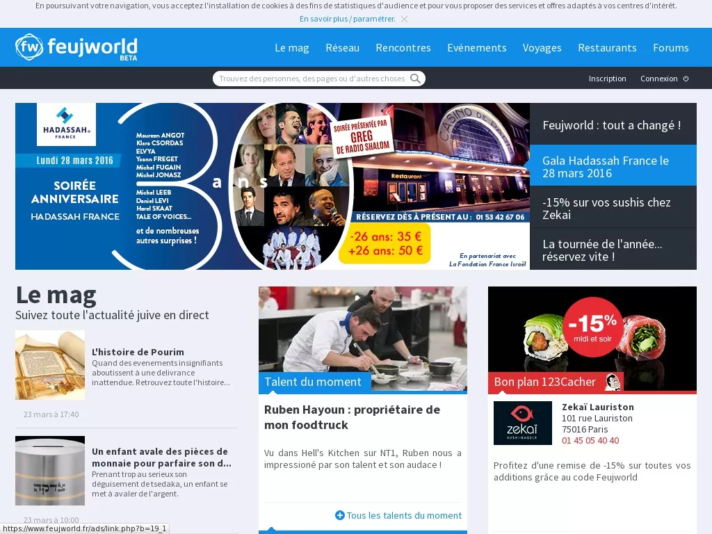 FeujWorld.fr, est avant tout un réseau social pour les juifs. En plus de proposer sa communauté de faire des rencontres juives, il propose aussi un magazine, un forum, des activités tels que des voyages et j’en passe.