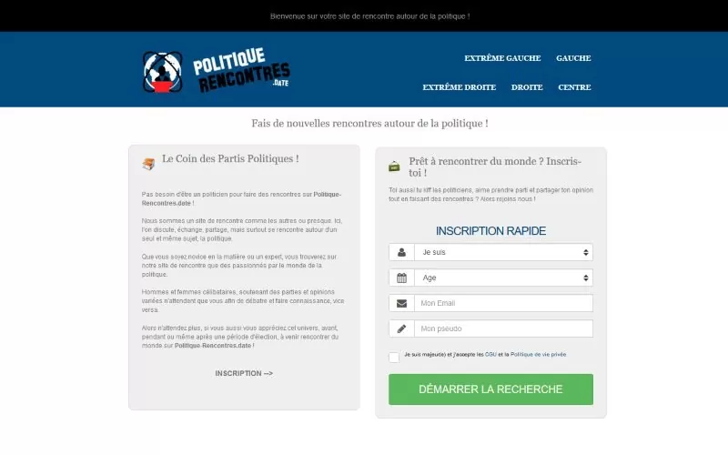 Politique-rencontres n’est définitivement pas un site de rencontre banal : il met à profit votre passion pour la politique pour trouver l’âme-sœur. Ici aussi, les formules classiques fonctionnent : la plateforme vise les échanges, le partage, les discussions (parfois passionnées) pour faire connaitre votre point de vue politique. Il n’y a cependant pas besoin d’être un expert pour vous faire entendre : les novices y trouvent facilement leur place… à condition de participer et de savoir argumenter !