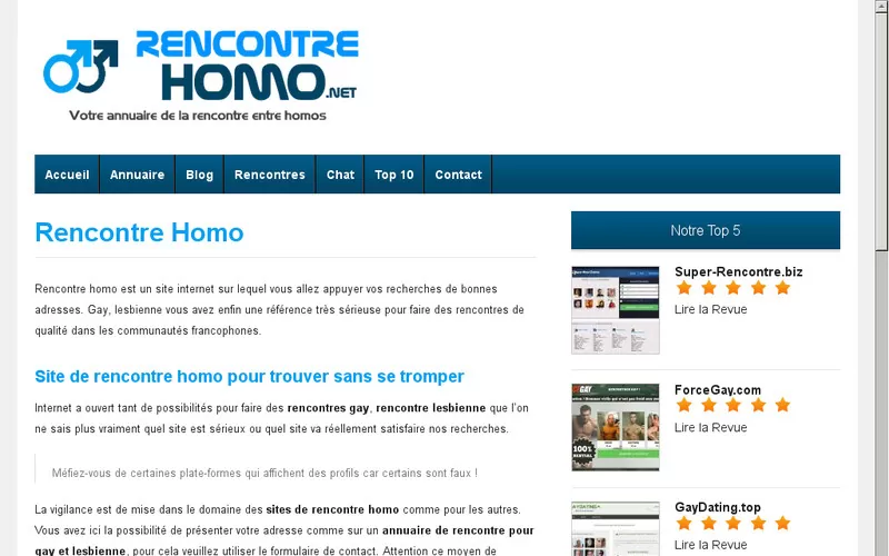Lorsque j’ai atterri sur la page d’accueil de Rencontre-Homo, j’ai d’abord remarqué la simplicité de son identité. Le site ne fait pas dans l’excès, et seul son titre laisse penser qu’il s’agit d’un annuaire en ligne. La première description qui vous tombera sous les yeux annonce d’emblée que les bonnes adresses pour faire des rencontres entre gays sont ici. Le répertoire est large, et sert aussi bien les gays que les lesbiennes. rencontre-homo.net affirme que les plateformes qui y sont référencées sont largement reconnues pour leur sérieux.