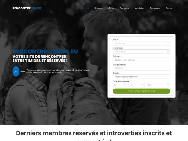 www.rencontre-timide.eu n’est autre qu’un site de rencontres sur internet semblable aux autres. Il dispose juste la particularité d’être en ligne pour des personnes bien précis. Entre autre, sur rencontre-timide.eu, les personnes s’inscrivent afin de rencontrer des timides et puis c’est tout.