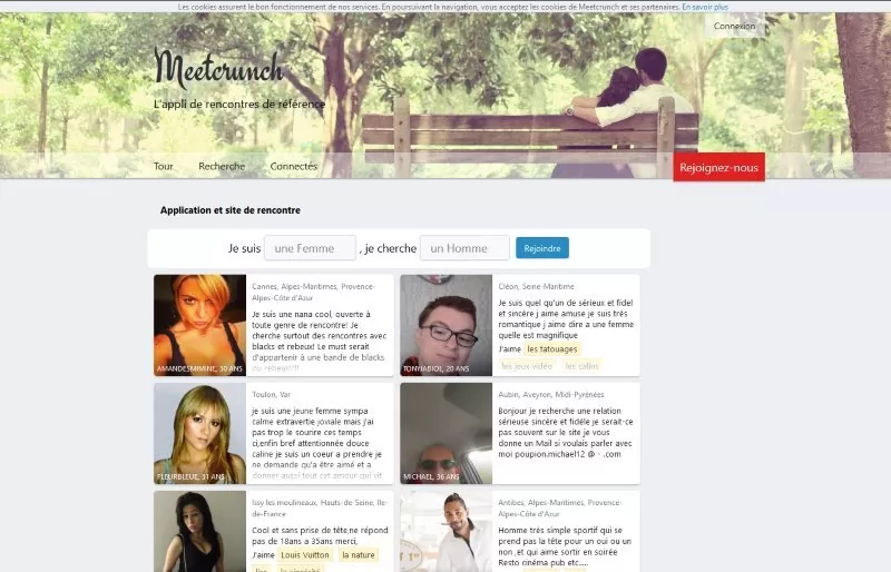 Meetcrunch.com permet de visiter quelques parties du site sans s’inscrire avant tout. Si on fait le tour en tant que visiteur donc, on tombe sur une page remplie de petites annonces de rencontre. Cependant, l’interface vire vers celle d’un vrai site de rencontre une fois connecté.
